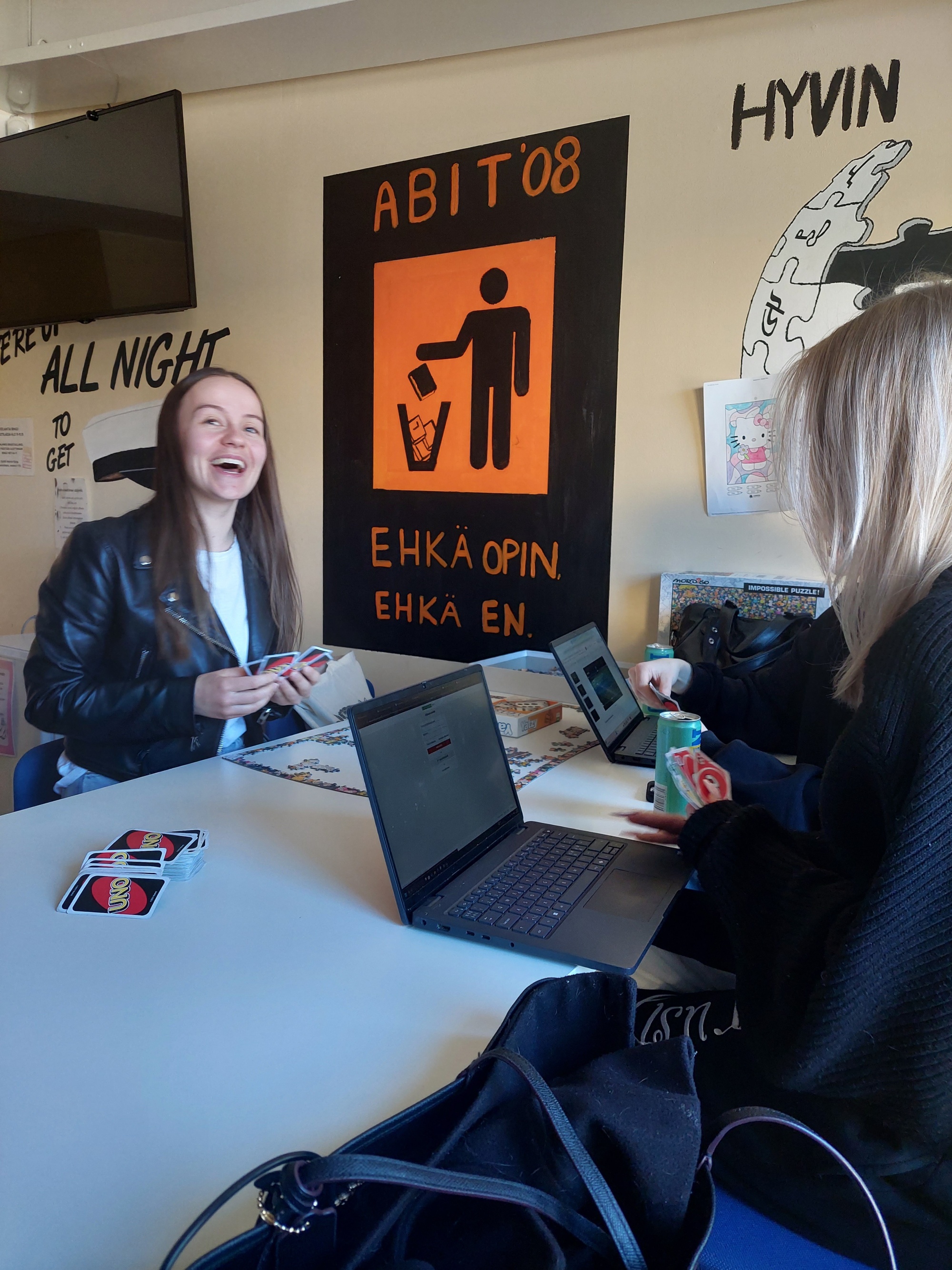 Joka viikko olemme yrittäneet päästä mahdollisimman monilla välitunneilla opiskelijoiden näkyville niin Hyrylässä, Jokelassa kuin Kellokoskellakin. Usein meillä on välitunneille jotain tekemistä. Välituntitekemisenä toimii esimerkiksi bingo, lautapelit ja palapelit sekä erilaiset skabat, joihin osallistumalla voi voittaa pieniä palkintoja. Välituntitekeminen voi myös liittyä meneillään olevaan teemaviikkoon tai lähellä olevaan teemapäivään. Tällaisia teemapäiviä tai -viikkoja ovat esimerkiksi ystävänpäivä, laskiainen ja opiskelijoiden mielenterveysviikko. Laskiaisriehassa vietettiin aikaa pulkkamäessä yhdessä laskien, minkä jälkeen päästiin ruokailemaan laskiaispullien ja kaakaon kera. Työssä olen osallistunut ykkösten ryhmäytysten ohjaamiseen sekä niiden suunnitteluun. Muita tapahtumia ja retkiä, joille Elisa on kouluvalmentajan työssä päässyt osallistumaan, ovat muun muassa Jokelan retkeilykurssit Repovedelle ja Evolle, yökoulut ja kevätretket. Retkeilykursseilla on lähdetty opiskelijoiden kanssa yön yli kansallispuistoon lyhyelle vaellukselle, jossa on päästy yhdessä nuotion ääreen paistamaan makkaraa ja vaahtokarkkeja. Ja kaikkien näiden välituntitoimintojen, reissujen ja retkien suunnittelu sekä toteutus on iso osa kouluvalmentajan työtä. Tämän lisäksi olen päässyt seuraamaan abien penkkaripäivää sekä kakkosten Wanhoja. Olin mukana myös Kellokosken Winter games -laneilla. Muutamasta tapahtumasta olen päässyt kuvaamaan videoita ja tekemään someen postauksia.